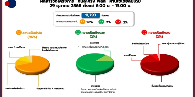 “คนละครึ่ง พลัส” วันแรก (29 ตุลาคม 2568) ผู้ใช้ Social Media 96% จาก 11,793 ข้อความ ตั้งแต่เวลา 6.00 น.-13.00 น. มีการแชร์ข้อมูลว่า มีเงินจากโครงการเข้าสู่แอป “เป๋าตัง” แล้ว มีการสอบถามถึงจำนวนเงินที่ใช้ได้ต่อวัน และ ร้านค้าที่เข้าร่วมโครงการเป็นหลัก ในขณะที่อีก 2% ให้ความเห็นในเชิงบวกในการใช้จ่ายกับรถไฟฟ้าได้ และ สร้างความคึกคักให้กับเศรษฐกิจ และ อีก 2% มีความเห็นว่า ขั้นตอนการลงทะเบียนของร้านค้าซับซ้อน