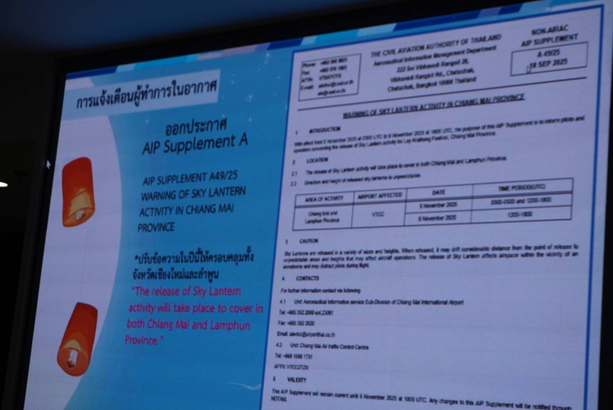 “ปีที่ผ่านมาทางศูนย์ควบคุมการบินได้รับแจ้งจากนักบินได้พบโคมลอย โคมควันในเส้นทางบิน 22 เที่ยงบิน โดยพบในเส้นทางบินขณะผ่านจังหวัดลำพูน 6 เที่ยวบิน และจังหวัดเชียงใหม่ 16 เที่ยวบิน นอกจากนี้ยังพบว่าทางด้านทิศใต้ของสนามบินเชียงใหม่มีการขออนุญาตและปล่อยโคมลอยกันมาก ทางศูนย์ควบคุมการบินจึงได้เปลี่ยนเป็นทางขึ้น-ลงเครื่องบินใหม่ รวมถึงเวลาขึ้น-ลงก็มีการปรับเช่นเดียวกัน เพื่อหลีกเลี่ยงและป้องกันผลกระทบที่อาจจะเกิดขึ้น แต่ทั้งนี้ขอความร่วมมือหน่วยงานที่เกี่ยวข้องประสานและควบคุมให้เป็นไปตามแนวทางที่แจ้งขออนุญาตด้วย โดยเฉพาะการปล่อยโคมลอยปล่อยได้เพียงวันที่ 5-6 พ.ย.68 ตามที่มีการขออนุญาตเท่านั้น”ผอ.ศูนย์ควบคุมการบินเชียงใหม่ กล่าว.