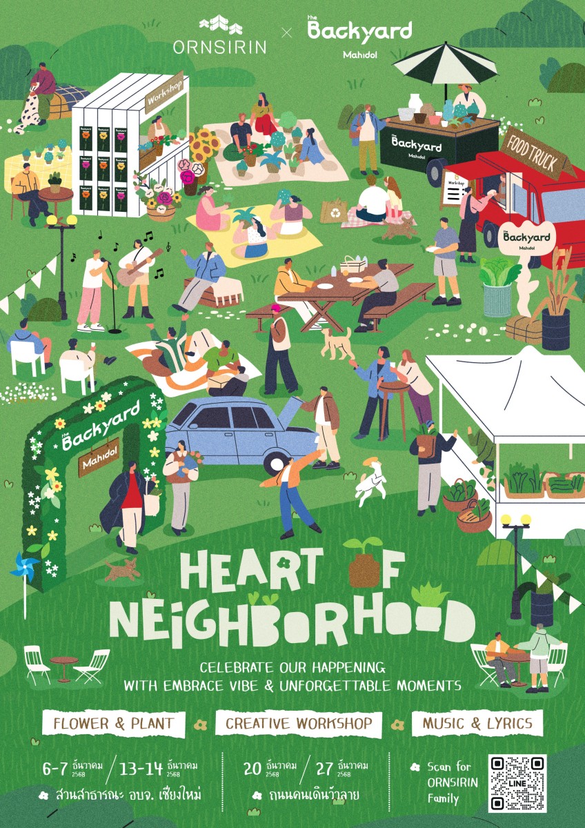 สำหรับคอมมูนิตี้มอลล์อย่าง THE BACKYARD MAHIDOL ได้จัดให้มีกิจกรรม ON GROUND ACTIVITY ในคอนเซปต์ “HEART OF NEIGHBORHOOD” สร้างความสุขเชื่อมโยงผู้คนอย่างยั่งยืน สู่การเป็น ORNSIRIN FAMILY กับกิจกรรมแจกดอกไม้คอลเลคชั่นพิเศษและกระเป๋ากระสอบสุด UNIQUE พิเศษสุด สำหรับลูกบ้านอรสิรินและนักเรียนโรงเรียน MILLHILL ร่วมกิจกรรม WORKSHOP ศิลปะฟรี!! ตลอดเดือนธันวาคม 2568 นี้ ท่ามกลางบรรยากาศกลางสวนที่ทุกคนในครอบครัวมาร่วมเป็นส่วนหนึ่งด้วยกันได้ทั้งสวนสาธารณะ อบจ. และถนนคนเดินวัวลาย โดยกิจกรรมจะเริ่มตั้งแต่เวลา 16.00น. – 19.00 น. หมุนเวียนเปลี่ยนสวนสร้างสีสันวันหยุดตลอดเดือนธันวาคม 2568 อาทิ วันที่ 6-7 ธ.ค. และ 13-14 ธ.ค. 68 สวนสาธารณะ อบจ. / วันที่ 20 และ 27 ธ.ค. 68 ถนนคนเดินวัวลาย