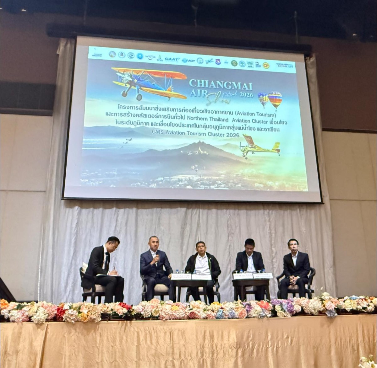 การเสวนาหัวข้อ โอกาสการท่องเที่ยวเชิงอากาศยาน (Aviation Tourism) ในพื้นที่อนุภูมิภาค ลุ่มแม่น้ำโขงและอาเซียน และการสร้าง Northern Thailand Aviation Cluster โดย พลอากาศเอก พิบูลย์ วรวรรณปรีชา กรรมการผู้จัดการ บริษัท อุตสาหกรรมการบิน จำกัด นพ.กรพรหม แสงอร่าม CEO Airamb Air Chartered นาวาอากาศตรี สมชนก เทียมเทียบรัตน์ รักษาการ รองกรรมการ ผู้อำนวยการใหญ่ (สายงานมาตรฐานท่าอากาศยานและการบิน) การท่าอากาศยานแห่งประเทศไทย และนายอาคม สุวรรณกันธา เลขาธิการสมาคมการบินภาคเหนือ รวมถึง การประชุมเชิงปฏิบัติการ และแนวทางการจัดตั้ง Northern Thailand Aviation Cluster ในอนาคต และการสร้างเครือข่าย นักบินและสนามบินขนาดเล็กทั่วประเทศ เพื่อส่งเสริมท่องเที่ยวเชิงอากาศยานในพื้นที่อนุภูมิภาคลุ่ม แม่น้ำโขงและอาเซียน