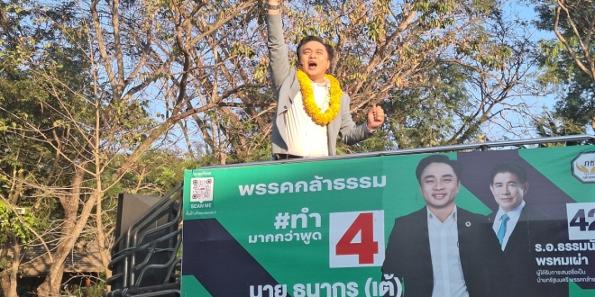 “ธนากร สุภาษา (เต้) – กล้าธรรม เบอร์ 4” ปราศรัยใหญ่โค้งสุดท้าย ณ หมาใจดำคาเฟ่ เผยเลือกตั้งครั้งนี้ชาวบ้านไม่เอากระแสแต่เลือกบุคคล ย้ำหาเสียงไม่โจมตีใครแม้ต้นทุนพรรคจะสู้ 2 พรรคใหญ่ไม่ได้ อ้อนขอคนบ้านเฮาเลือกเข้าไปพัฒนาบ้านเกิด