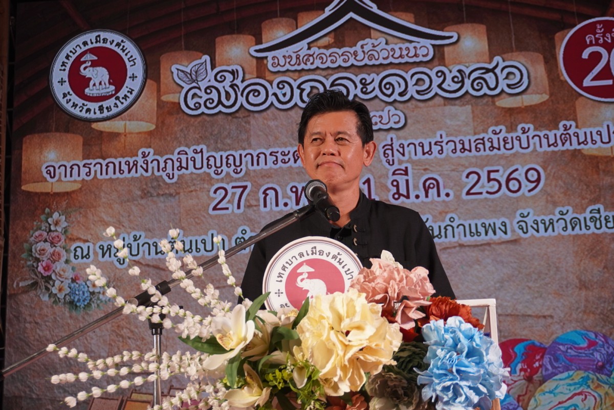 วันที่ 27 กุมภาพันธ์ 2569 เวลา 17.00 น. ณ หมู่บ้านต้นเปา ตำบลต้นเปา อำเภอสันกำแพง จังหวัดเชียงใหม่ นายคเณศ คำนนท์ นายอำเภอ สันกำแพง เป็นประธานในพิธีเปิดงาน “มหัศจรรย์ล้านนา เมืองกระดาษสาบ้านต้นเปา ครั้งที่ 20” ประจำปี 2569 ภายใต้แนวคิด “จากรากเหง้าภูมิปัญญากระดาษสา สู่งานร่วมสมัยบ้านต้นเปา” ซึ่งเทศบาลเมืองต้นเปา ร่วมกับ อำเภอสันกำแพง จัดขึ้นระหว่างวันที่ 27 กุมภาพันธ์ – 1 มีนาคม 2569 ณ หมู่บ้านต้นเปา เพื่อส่งเสริมและประชาสัมพันธ์แหล่งผลิตกระดาษสาที่ใหญ่ที่สุดในจังหวัดเชียงใหม่ พร้อมยกระดับอัตลักษณ์ท้องถิ่นสู่การพัฒนาอย่างยั่งยืน บรรยากาศภายในพิธีเปิดเป็นไปอย่างคึกคักและอบอุ่น โดยมี นายสุชาติ ไชยมงคล นายกเทศมนตรีเมืองต้นเปา คณะผู้บริหาร หัวหน้าส่วนราชการ ผู้นำชุมชน และประชาชนเข้าร่วมงานอย่างคับคั่ง สะท้อนถึงพลังความร่วมมือของทุกภาคส่วนในการสืบสานมรดกภูมิปัญญาท้องถิ่น