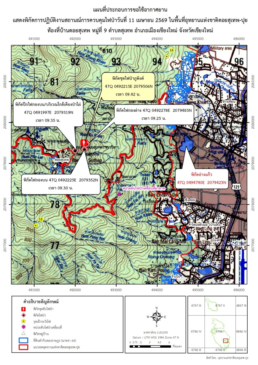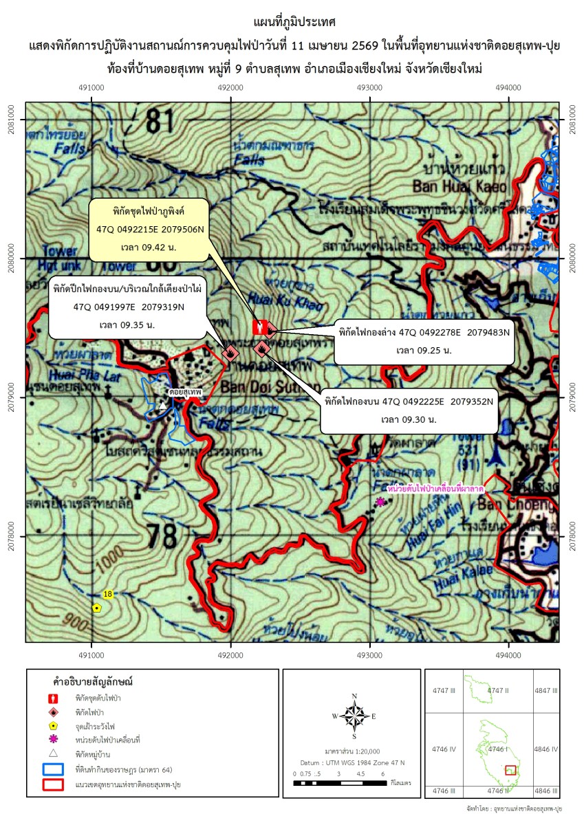 อย่างไรก็ตาม ในพื้นที่อุทยานแห่งชาติดอยสุเทพ+ปุยเป็นพื้นที่พิเศษของกลุ่มป่าหน้าดอย ที่ผ่านมามีการระดมทรัพยากรลงไปทั้งงบประมาณและอุปกรณ์อย่างเต็มที่ อย่างไรก็ดีมีข้อสังเกตจากทีมดับไฟว่ามีคนพยายามแอบลักลอบเข้ามาจุดไฟเผาหลายครั้งแต่ชุดลาดตระเวนพบเจอก่อนและสามารถควบคุมไฟได้ ล่าสุดเมื่อคืนวันที่ 10 เม.ย.69 มีคนลักลอบเผาที่บริเวณจุดน้ำตกศรีสังวาลย์ ต้องมีการระดมกำลังเข้าดับไฟเกือบครึ่งร้อยถึงสามารถควบคุมได้ แต่ก็ยังมึคนแอบลักลอบเผาในเวลาย่ำรุ่งโดยพบว่ามีการจุดไฟออกจากแนวกันไฟที่มีการจัดทำขึ้นก่อนหน้านั้นทั้งซ้ายและขวาทำให้ไฟลามอย่างรวดเร็ว ทั้งนี้เนื่องจากพื้นที่มีทางเข้า-ออกหลายทาง ประกอบกับเป็นทั้งเส้นทางเดินป่าและทางจักรยาน มอเตอร์ไซด์ผ่านได้ง่ายด้วย.