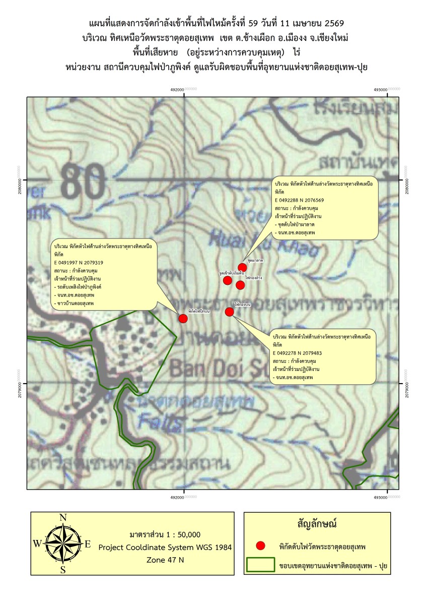 เมื่อเวลา 08.30 น.วันที่ 11 เม.ย.69 เจ้าหน้าที่ได้รับรายงานพบกลุ่มควันไฟบริเวณใกล้วัดพระธาตุดอยสุเทพจำนวน 2 จุด อุทยานแห่งชาติดอยสุเทพ-ปุยเร่งระดมทีมลงพื้นที่ โดยพบว่ามีไฟเกิดขึ้น 3 จุด โดยจัดกำลังดับไฟปีกบนใกล้กอไผ่ จุดไฟใหญ่ที่บริเวณไฟชุดใหญ่อยู่ตรงจุดผาผึ้งให้ชุดดับไฟป่าภูพิงค์ดำเนินการและไฟปีกซ้ายกองบน แต่เนื่องจากเชื้อเพลิงสะสมมากและติดไฟอย่างรวดเร็วทำให้ไฟขยายเป็นวงกว้างเพิ่มเป็น 5 จุด จึงระดมกำลังเพิ่มพร้อมประสานขอเฮลิคอปเตอร์จากกระทรวงทรัพยากรธรรมชาติและสิ่งแวดล้อมมาช่วยทิ้งน้ำเนื่องจากสภาพพื้นที่เป็นที่ลาดชันด้วย