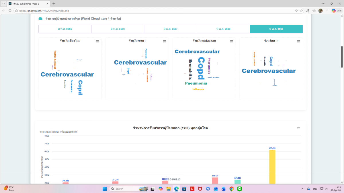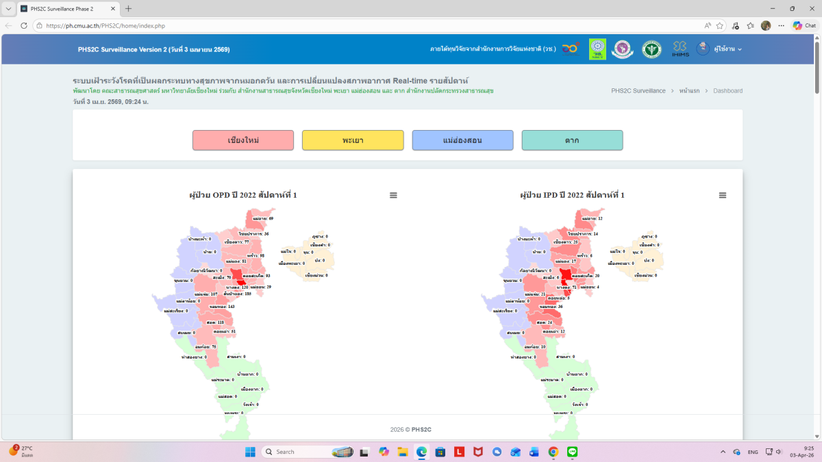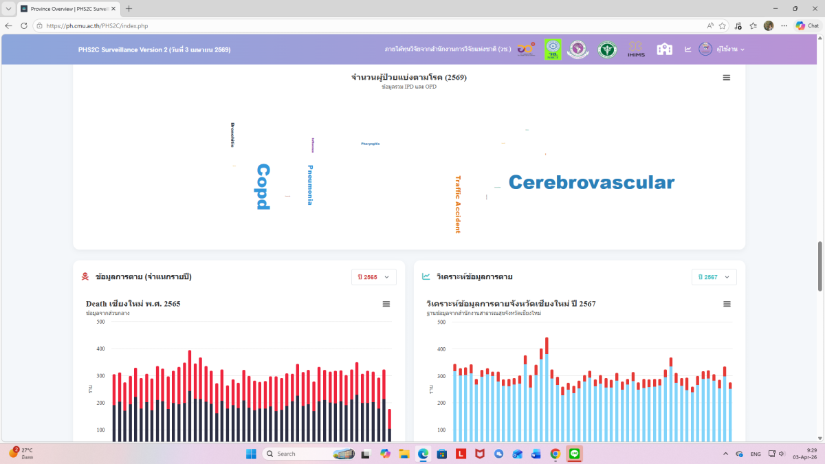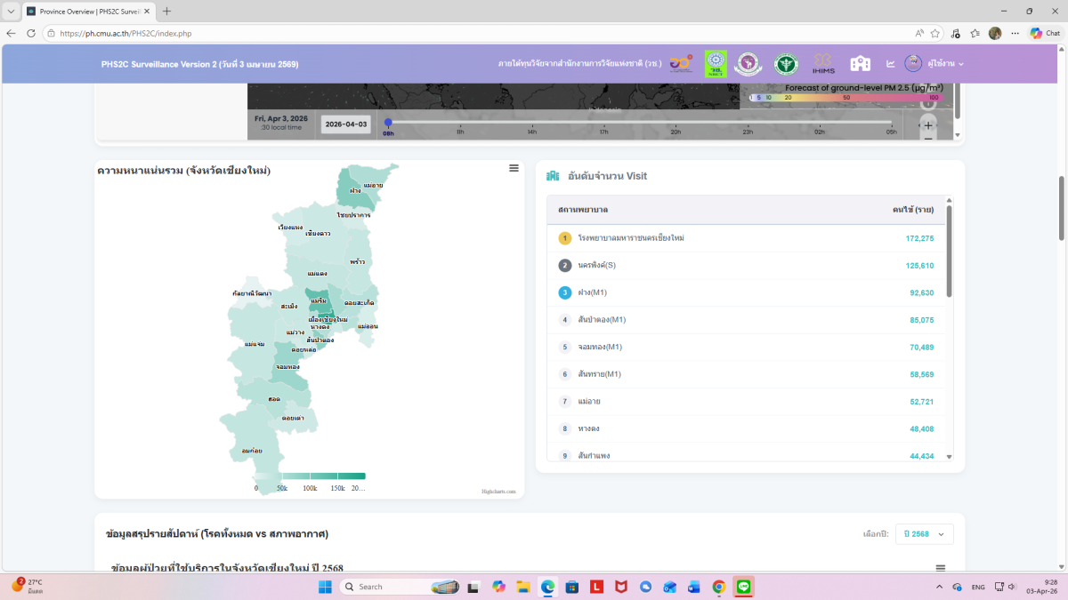 และอีกโรคที่พบว่า มีสถิติจำนวนผู้ป่วยที่เข้ามารับการรักษาค่อนข้างสูงใกล้เคียงกัน ทั้งจำนวนผู้ป่วย นอกและผู้ป่วยใน ได้แก่ โรคหลอดเลือดสมอง หรือ สะโตรก ในช่วง 3-4 ปีที่ผ่านมาเช่นกัน ซึ่งสามารถเข้าเว็บไซท์ไปดู Dashboard เพื่อแสดงผลได้ตามลิ้งค์ https://ph.cmu.ac.th/PHS2C/home/ โดยพร้อมเปิดให้ใช้งานแสดงผลการติดตาม สถานการณ์โรคที่อยู่ในระบบการเฝ้าระวังในทั้ง 4 จังหวัดได้ตั้งแต่วันที่ 3 เมษายน พ.ศ. 2569 เป็นต้นไป ระบบการเฝ้าระวังโรค ฯ ดังกล่าว จะมีส่วนสำคัญที่ช่วยให้ข้อมูลแก่หน่วยงานด้านสาธารณสุข สามารถติดตามสถานการณ์ สถิติการเจ็บป่วยของผู้ป่วยในกลุ่มโรคที่มีการเฝ้าระวังอย่างใกล้ชิดที่เข้ามารับการรักษาในโรงพยาบาลแต่ละระดับในพื้นที่ 4 จังหวัด อย่างเป็นปัจจุบัน และหน่วยงานอื่น ๆ ที่เกี่ยวข้อง สามารถนำข้อมูลสถานการณ์ดังกล่าวไปแจ้งเตือนประชาชนในพื้นที่ ให้เพิ่มการระมัดระวังดูแลสุขภาพของตนเอง โดยเฉพาะในกลุ่มเปราะบาง เด็กเล็ก ผู้สูงวัย และผู้ป่วยที่เป็นโรคระบบทางเดินหายใจ และโรคเรื้อรัง ในช่วงที่มีมลภาวะทางอากาศเพิ่มสูงขึ้น มีค่าฝุ่น PM 2.5 ที่สูงมาก ๆ เหมือนในช่วงสัปดาห์ที่ผ่านมาจนถึง ปัจจุบันในพื้นที่ภาคเหนือตอนบน รวมไปถึงการบริหารทรัพยากร อัตราการครองเตียงในแต่ละโรงพยาบาล การจัดบุคลากร ทางการแพทย์เวชภัณฑ์ยารักษาโรคที่จำเป็นต้องใช้เพื่อการรักษาผู้ป่วย และเครื่องมือแพทย์ในแต่ละโรงพยาบาลล่วงหน้า การจัดทำแผนเผชิญเหตุจากปัญหาผลกระทบจากปัญหาหมอกควันต่อประชาชนในพื้นที่โดยใช้ข้อมูลการเจ็บป่วยที่เป็นปัจจุบัน รวมถึงการสนับสนุนงบประมาณในพื้นที่เสี่ยง และการติดตามประสิทธิผลของมาตรการต่าง ๆ ในการป้องกันและแก้ไขปัญหา ทั้งในระยะสั้นและระยะยาวในพื้นที่ที่ได้รับผลกระทบจากปัญหาหมอกควัน รวมถึงการเปลี่ยนแปลงสภาพอากาศอย่างทันสถานการณ์.