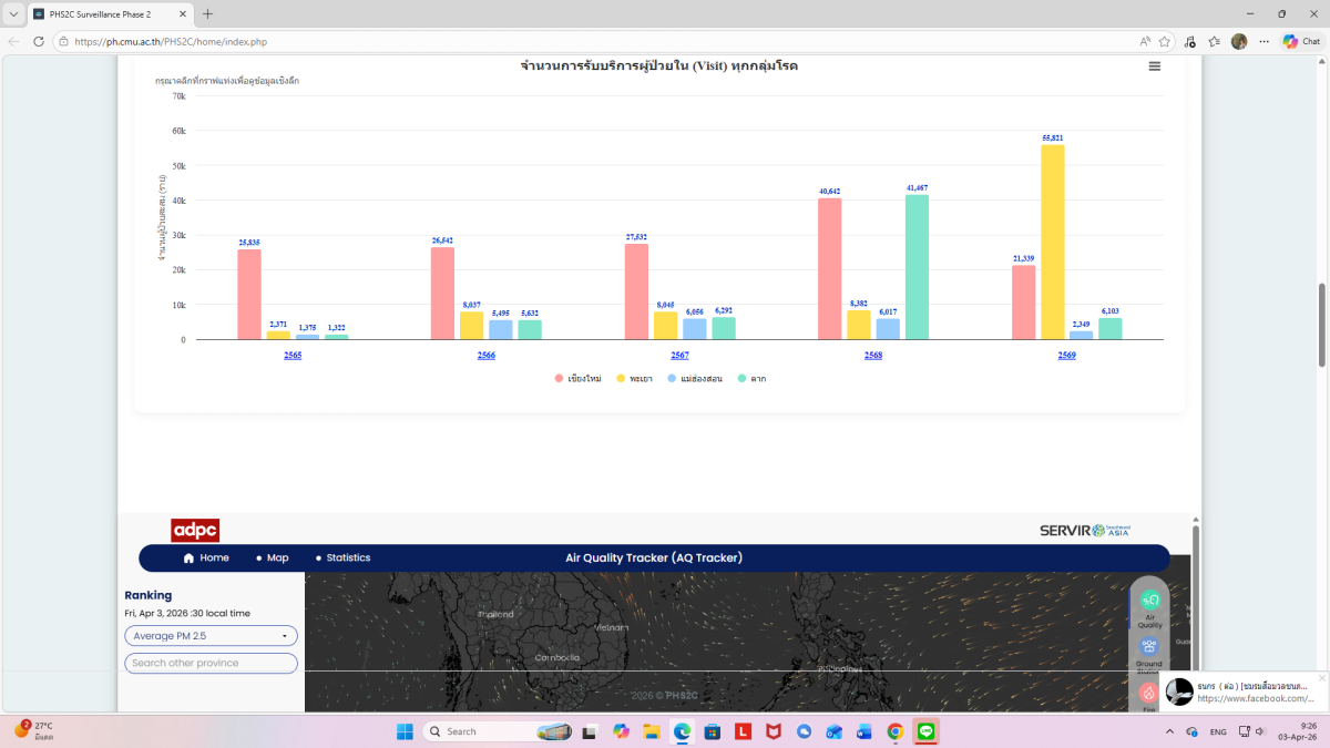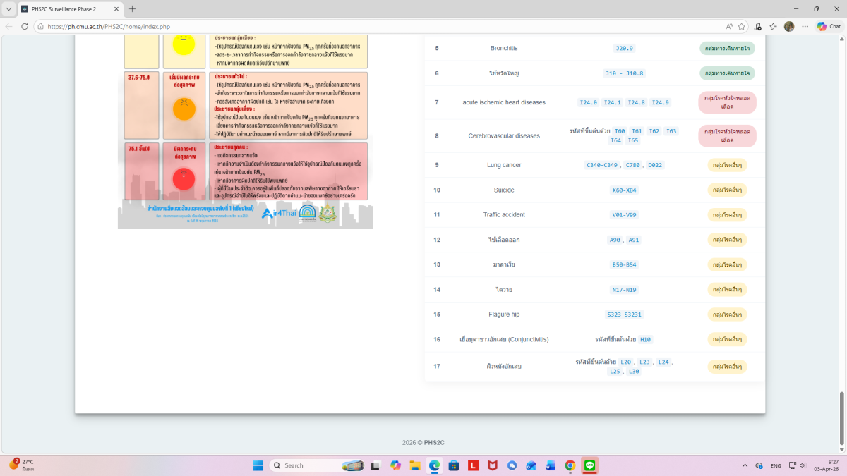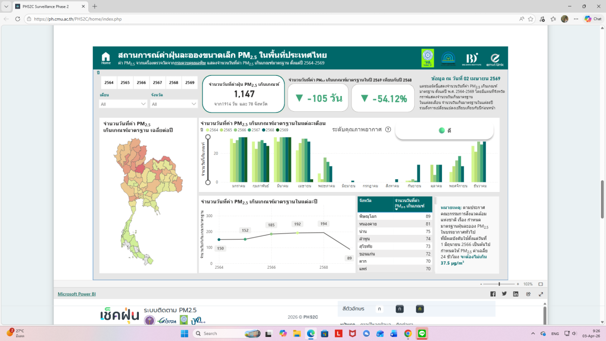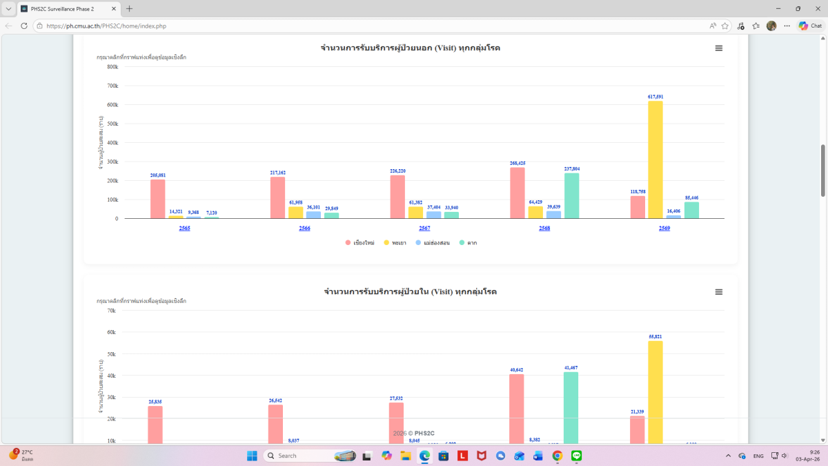 และอีกโรคที่พบว่า มีสถิติจำนวนผู้ป่วยที่เข้ามารับการรักษาค่อนข้างสูงใกล้เคียงกัน ทั้งจำนวนผู้ป่วย นอกและผู้ป่วยใน ได้แก่ โรคหลอดเลือดสมอง หรือ สะโตรก ในช่วง 3-4 ปีที่ผ่านมาเช่นกัน ซึ่งสามารถเข้าเว็บไซท์ไปดู Dashboard เพื่อแสดงผลได้ตามลิ้งค์ https://ph.cmu.ac.th/PHS2C/home/ โดยพร้อมเปิดให้ใช้งานแสดงผลการติดตาม สถานการณ์โรคที่อยู่ในระบบการเฝ้าระวังในทั้ง 4 จังหวัดได้ตั้งแต่วันที่ 3 เมษายน พ.ศ. 2569 เป็นต้นไป ระบบการเฝ้าระวังโรค ฯ ดังกล่าว จะมีส่วนสำคัญที่ช่วยให้ข้อมูลแก่หน่วยงานด้านสาธารณสุข สามารถติดตามสถานการณ์ สถิติการเจ็บป่วยของผู้ป่วยในกลุ่มโรคที่มีการเฝ้าระวังอย่างใกล้ชิดที่เข้ามารับการรักษาในโรงพยาบาลแต่ละระดับในพื้นที่ 4 จังหวัด อย่างเป็นปัจจุบัน และหน่วยงานอื่น ๆ ที่เกี่ยวข้อง สามารถนำข้อมูลสถานการณ์ดังกล่าวไปแจ้งเตือนประชาชนในพื้นที่ ให้เพิ่มการระมัดระวังดูแลสุขภาพของตนเอง โดยเฉพาะในกลุ่มเปราะบาง เด็กเล็ก ผู้สูงวัย และผู้ป่วยที่เป็นโรคระบบทางเดินหายใจ และโรคเรื้อรัง ในช่วงที่มีมลภาวะทางอากาศเพิ่มสูงขึ้น มีค่าฝุ่น PM 2.5 ที่สูงมาก ๆ เหมือนในช่วงสัปดาห์ที่ผ่านมาจนถึง ปัจจุบันในพื้นที่ภาคเหนือตอนบน รวมไปถึงการบริหารทรัพยากร อัตราการครองเตียงในแต่ละโรงพยาบาล การจัดบุคลากร ทางการแพทย์เวชภัณฑ์ยารักษาโรคที่จำเป็นต้องใช้เพื่อการรักษาผู้ป่วย และเครื่องมือแพทย์ในแต่ละโรงพยาบาลล่วงหน้า การจัดทำแผนเผชิญเหตุจากปัญหาผลกระทบจากปัญหาหมอกควันต่อประชาชนในพื้นที่โดยใช้ข้อมูลการเจ็บป่วยที่เป็นปัจจุบัน รวมถึงการสนับสนุนงบประมาณในพื้นที่เสี่ยง และการติดตามประสิทธิผลของมาตรการต่าง ๆ ในการป้องกันและแก้ไขปัญหา ทั้งในระยะสั้นและระยะยาวในพื้นที่ที่ได้รับผลกระทบจากปัญหาหมอกควัน รวมถึงการเปลี่ยนแปลงสภาพอากาศอย่างทันสถานการณ์.