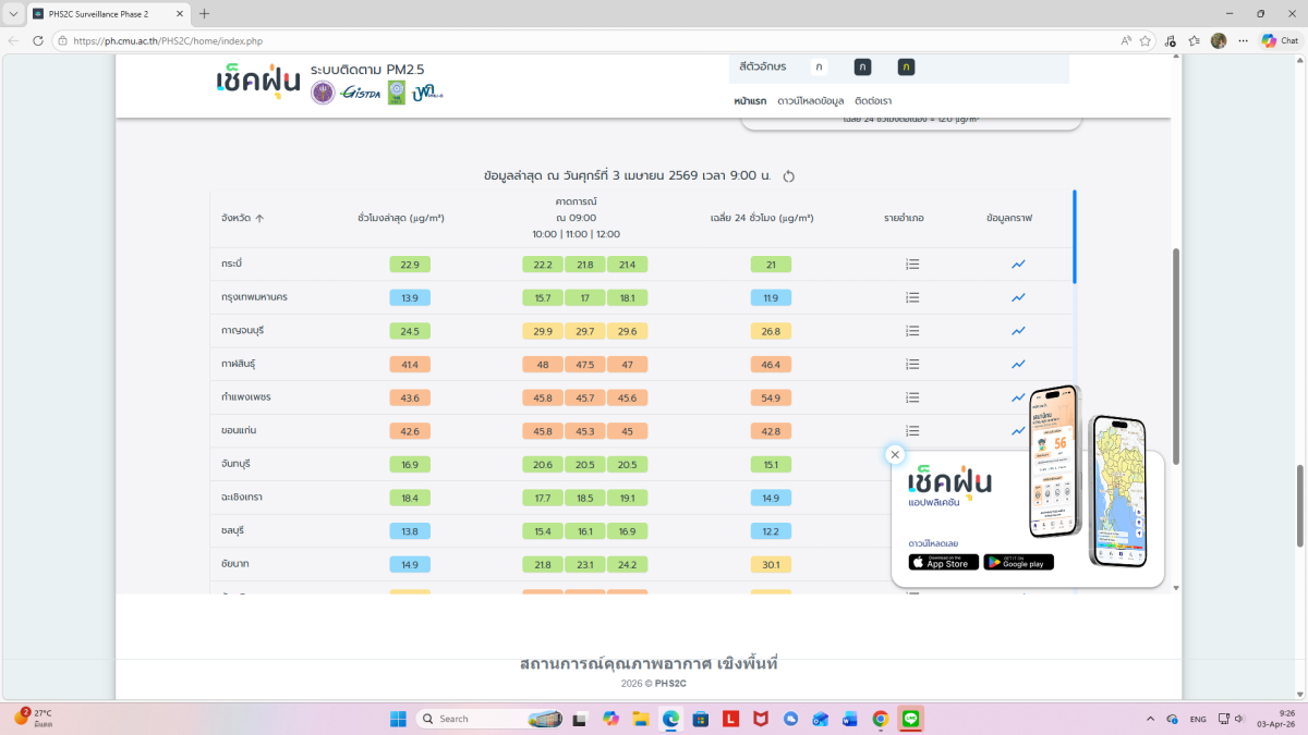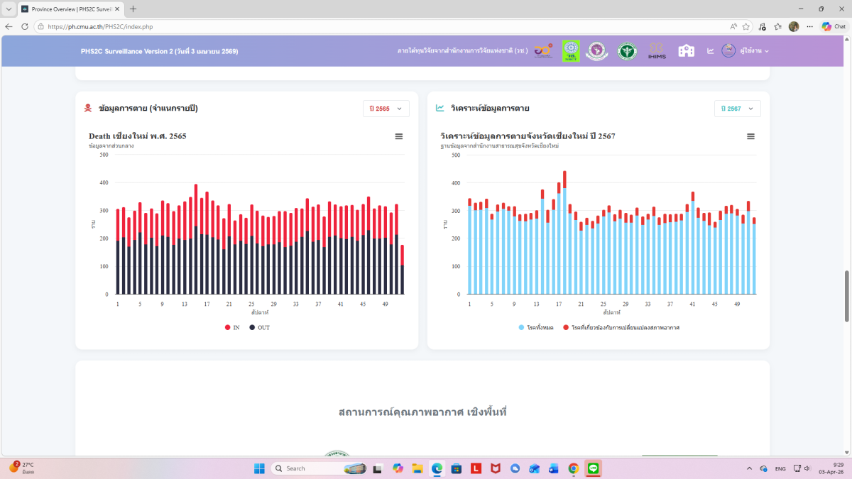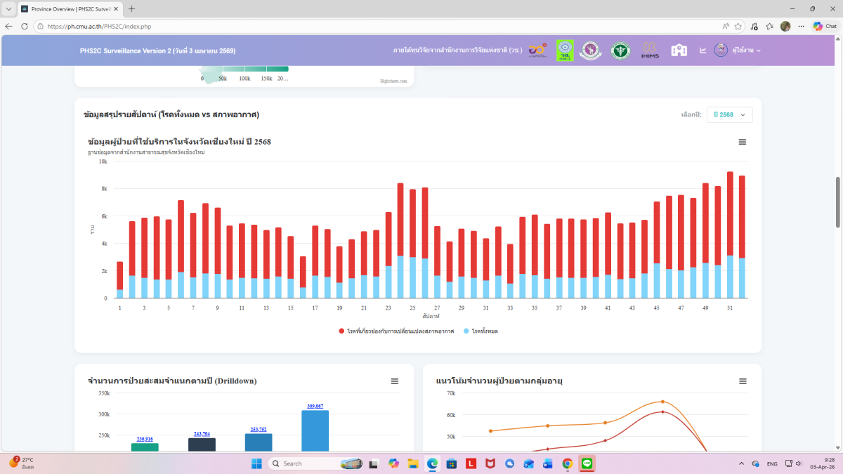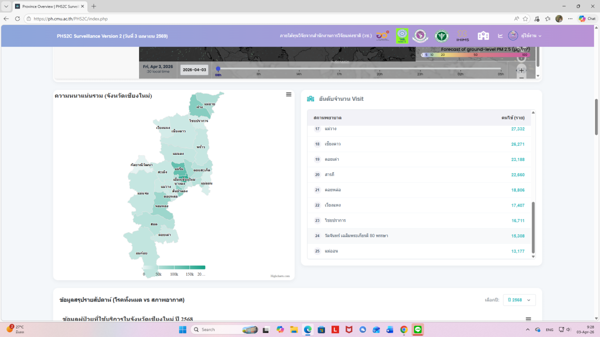 ศาสตราจารย์เกียรติคุณ ดร.นพ.สุวัฒน์ จริยาเลิศศักดิ์ คณะสาธารณสุขศาสตร์ มหาวิทยาลัยเชียงใหม่ หัวหน้าโครงการวิจัย “ระบบเฝ้าระวังโรคและผลกระทบทางสุขภาพระดับจังหวัดในเขตภาคเหนือตอนบน แบบเป็นปัจจุบัน ระยะที่ 2” ได้รับทุนสนับสนุนจาก สำนักงานการวิจัยแห่งชาติ (วช.) ในสังกัดกระทรวงอุดมศึกษา วิทยาศาสตร์ วิจัย และนวัตกรรม (อว.) ในช่วง 2-3 ปีที่ผ่านมา คณะสาธารณสุขศาสตร์ มหาวิทยาลัยเชียงใหม่ ร่วมกับ สำนักงานสาธารณสุขจังหวัดเชียงใหม่ โดยมีท่านนายแพทย์สาธารณสุขจังหวัด และนายแพทย์วรวุฒิ โฆวัชรกุล ผู้ช่วยนายแพทย์สาธารณสุขจังหวัดเชียงใหม่และ ผู้อ านวยการโรงพยาบาลสันทราย รวมถึงกลุ่มงานสุขภาพดิจิทัล สำนักงานสาธารณสุขจังหวัดเชียงใหม่ ได้ร่วมกันจัดทำ โครงการวิจัยพัฒนาระบบเฝ้าระวังโรคที่เป็นผลกระทบจากปัญหาหมอกควันและการเปลี่ยนแปลงสภาพอากาศ แบบเป็น ปัจจุบัน (Realtime) (ระยะที่ 1) โดยได้รับทุนสนับสนุนการวิจัยจากทาง วช. โดยเป็นการบริหารจัดการข้อมูลขนาดใหญ่ แสดงผลข้อมูลสถิติการเจ็บป่วยจากโรคที่เป็นผลกระทบจากปัญหามลภาวะทางอากาศของผู้ป่วยที่มาใช้บริการในโรงพยาบาลสังกัดกระทรวงสาธารณสุข ทั้งโรงพยาบาลจังหวัดและโรงพยาบาลชุมชนในทุกอำเภอ ในพื้นที่จังหวัดเชียงใหม่ โดยแสดงผลรวมของ ผู้ป่วยรายโรค แยกเป็นผู้ป่วยนอก ผู้ป่วยในที่ต้องนอนรักษาในโรงพยาบาล แสดงสถิติจำนวนผู้ป่วยเป็นรายสัปดาห์ ย้อนหลัง 5 ปีและต่อเนื่องมาจนถึงสถานการณ์ปัจจุบัน และสามารถแสดงสถิติผู้ป่วยจากโรคที่เฝ้าระวังจำแนกเป็นรายโรงพยาบาลในแต่ละ อำเภอได้ด้วย