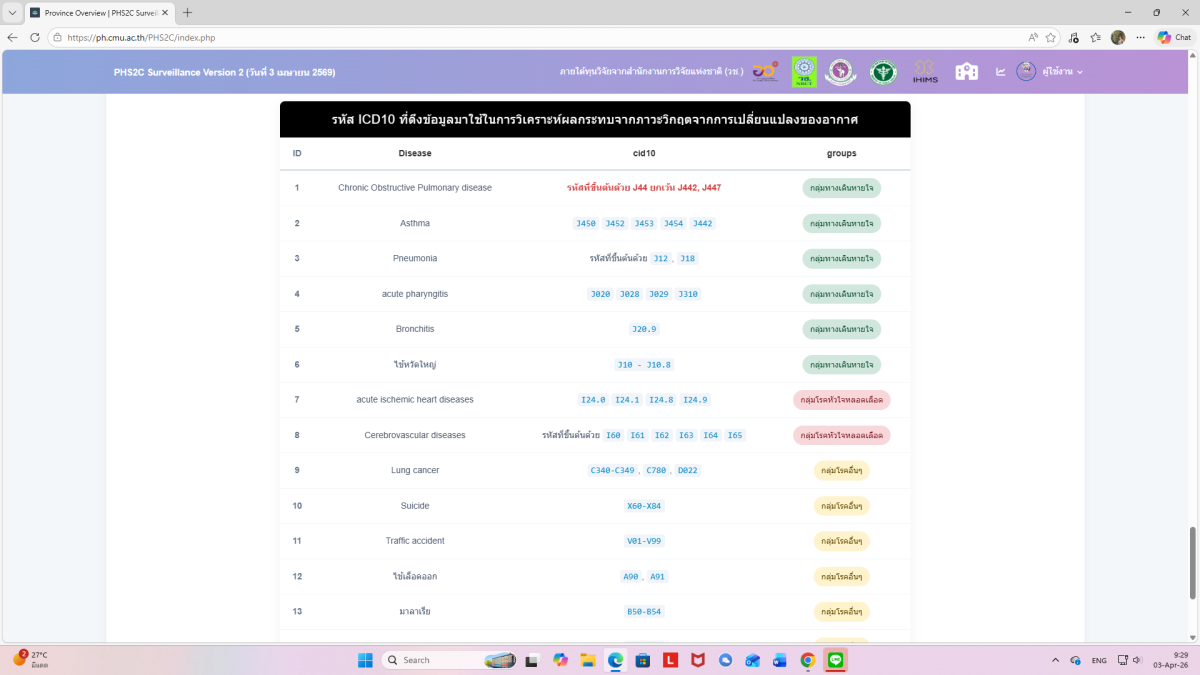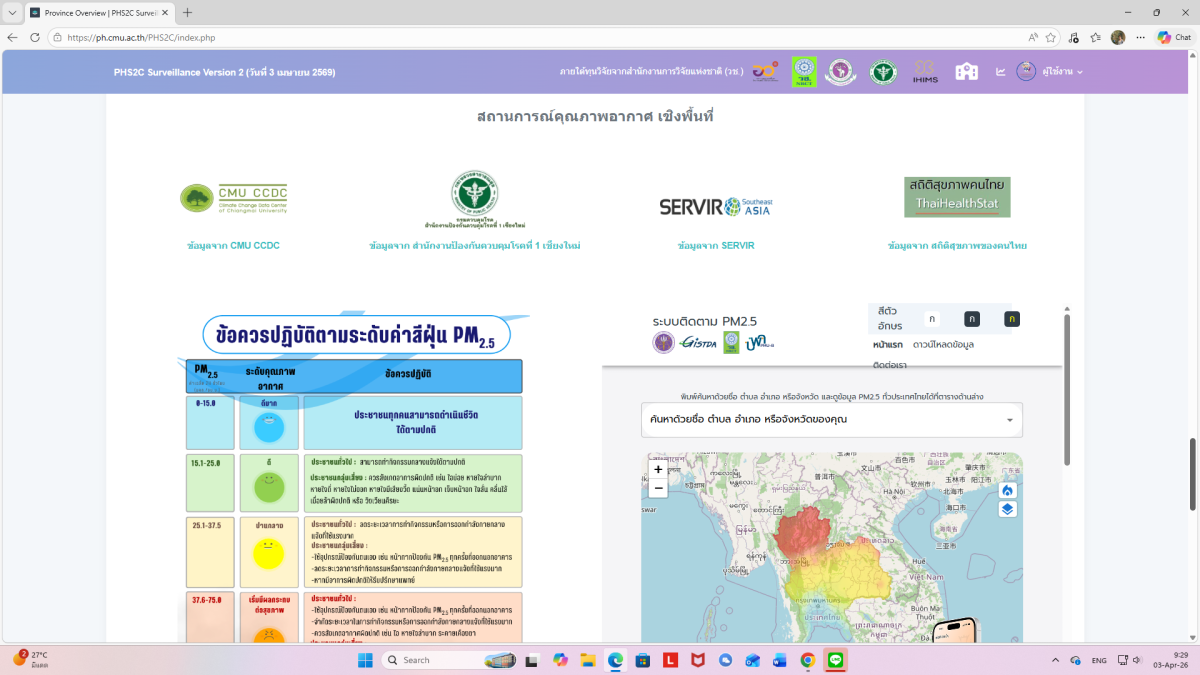 คณะสาธารณสุขศาสตร์ มช. เปิดตัวเว็บไซต์แสดง Dashboard ระบบการเฝ้าระวังโรคที่เป็นผลกระทบ จากปัญหาหมอกควันและการเปลี่ยนแปลงสภาพอากาศ แบบ Realtime ในเขตภาคเหนือตอนบน ระยะที่ 2 (Public Health Surveillance for Climate Change : PHS2C Dashboard Phase 2.0) https://ph.cmu.ac.th/PHS2C/home เผยพบผู้ป่วยโรคปอดอุดกลั้นเรื้อรังและโรคหลอดเลือดสมอง หรือ สะโตรก ในช่วง 3-4 ปีที่ผ่านมา แจงระบบดังกล่าวจะช่วยให้ข้อมูลแก่หน่วยงานด้านสาธารณสุข สามารถติดตามสถานการณ์ สถิติการเจ็บป่วยของผู้ป่วยในกลุ่มโรคที่มีการเฝ้าระวังอย่างใกล้ชิดที่เข้ามารับการรักษาในโรงพยาบาลแต่ละระดับในพื้นที่ 4 จังหวัด อย่างเป็นปัจจุบัน